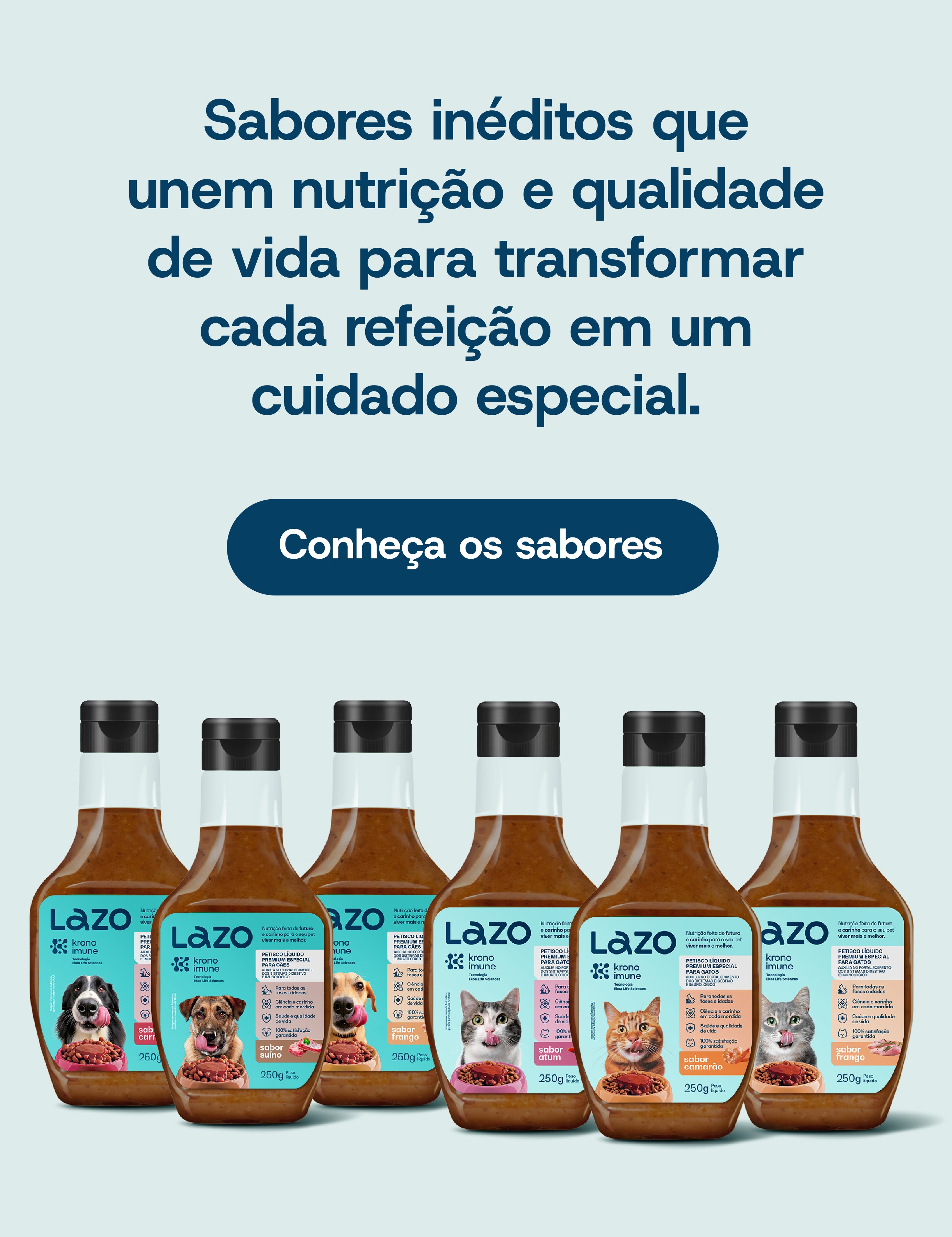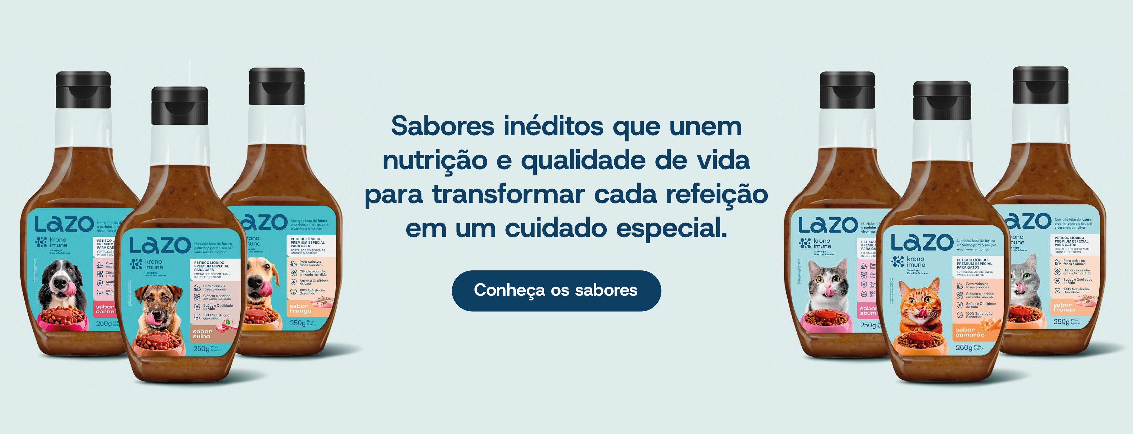 Com a exclusiva tecnologia Kronoimune, os produtos Lazo trazem microrganismos que oferecem mais saúde e vitalidade ao seu pet! Uma fórmula inovadora que promove bem-estar, fortalece o organismo e ajuda a prolongar a vida do seu amigo com proteção e cuidados que você pode confiar.