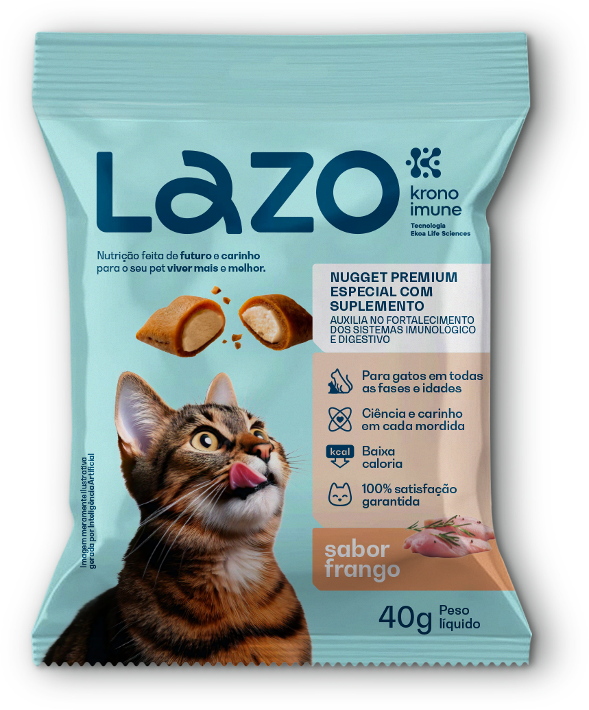 Os Nuggets Lazo sabor Frango foram criados para oferecer uma combinação ideal entre sabor, saúde e bem-estar para gatos de todas as fases da vida. Sua fórmula premium conta com suplemento funcional que auxilia no fortalecimento dos sistemas imunológico e digestivo, contribuindo para mais vitalidade, energia e qualidade de vida no dia a dia.